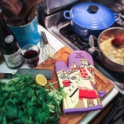 Oh, dear, that drink hit you hard. But no matter. This oven mitt’s got your back. Or your hand. Super-insulated cotton mitt with a lavender background features a retro illustration of a woman in an apron stirring something on the stove while partaking of a glass of wine. Next time, put down a base first. Makes a great hostess or housewarming gift.
