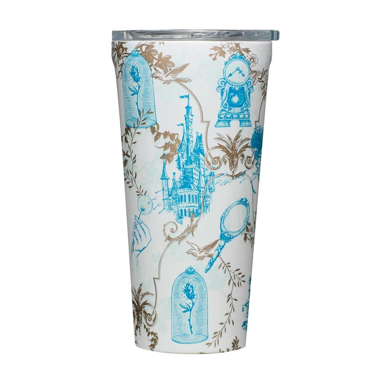- Corkcicle stainless steel insulated cup features illustrations from Disney’s “Beauty and the Beast” on white.