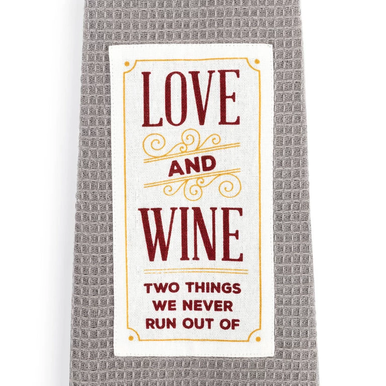 Share your love for friends, family, good timesāand a little vinoāwhen you use this charming kitchen towel boa. The wearable waffle weave towel goes wherever you go, making it a handy accessory for those busy moments in the kitchen. With a heartfelt sentiment about love and wine on the 100% cotton towel, it makes a perfect hostess or housewarming gift.