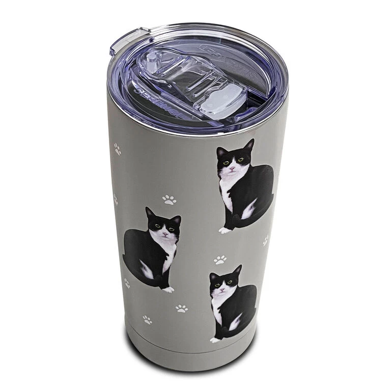 This Serengeti tumbler from E&S Pets comes with a BPA-free, spill-proof lid with an open-and-close slider. Stainless steel tumbler in gray features posing black-and-white tuxedo cats along with tiny paw prints. Using special 3D German printing technology with a high gloss finish, this fun kitty tumbler is the perfect gift for cat owners and cat lovers alike. It makes a great conversation starter when commuting, running errands and more.