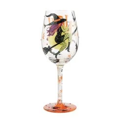 - Lolita handpainted wine glass features a witch riding a broomstick paired with a punny message.