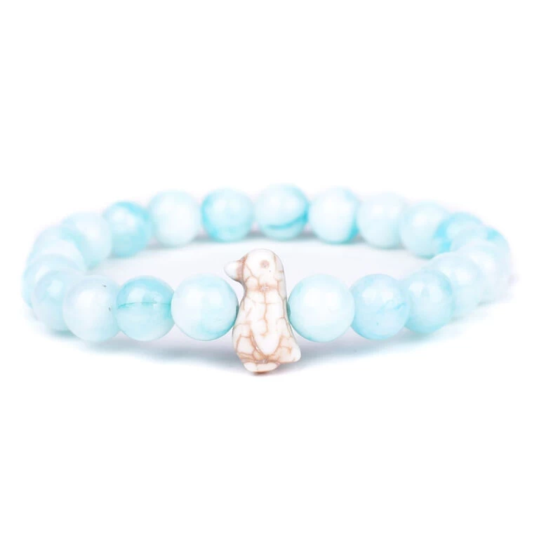 - Stretch bracelet features penguin and seafoam stone beads along with an assigned real penguin to track online.