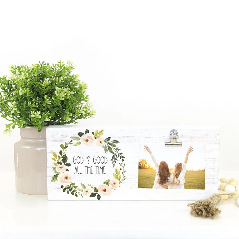 Clip and display your favorite photos with a rustic picture frame. White-washed wood decor features a metal clip for a horizontal 3×5 photo allowing you to easily change out pictures. The handcrafted, rustic photo holder features a spiritual message and floral design that are a perfect addition to any home decor.