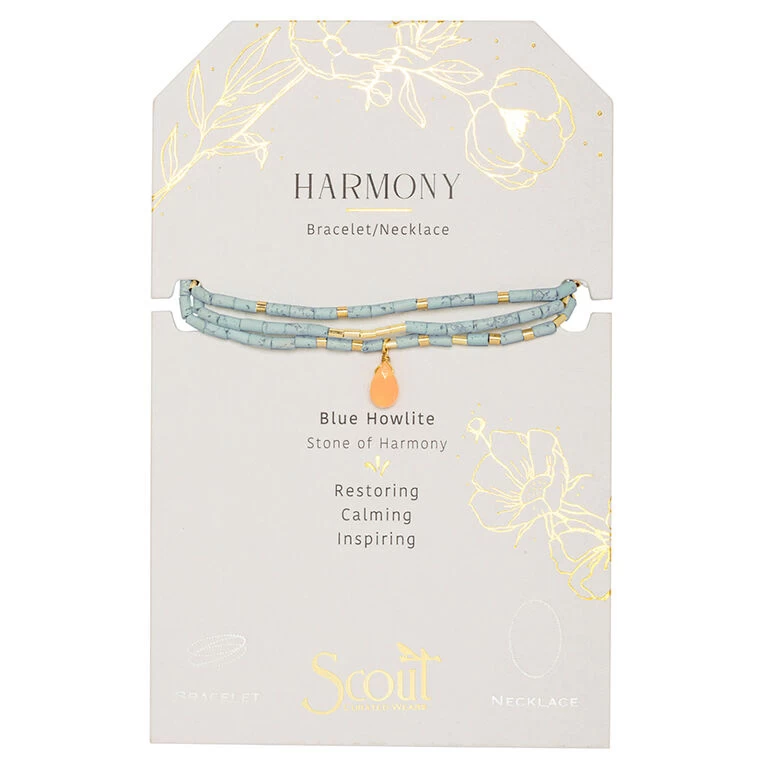 - On card: Harmony Bracelet/Necklace Blue Howlite Stone of Harmony: Restoring, Calming, Inspiring.