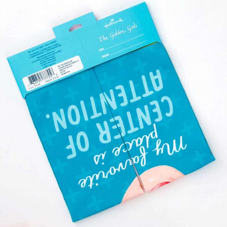 Make Blanche—and yourself—the center of attention when you wear these socks fit for a Southern belle. Adult-size crew socks feature an illustration of Blanche Devereaux from “The Golden Girls.” A funny quote and patterned design on a blue background with gold cuff and toe complete the fabulous footwear.