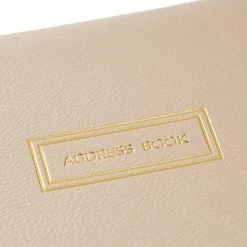 Keep your business contacts close by with this cream white, simulated leather address book on your desk. With coordinating gold spiral binding and a gold foil stamped cover title, this spacious binder features 300 individual address entries, letter tab dividers, a customizable calendar and address correction labels.