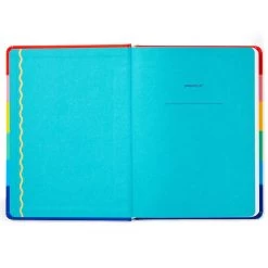 - Hardback notebook features gold foil lettering on a striped design in coral, pink, yellow, mint green, turquoise and dark blue.