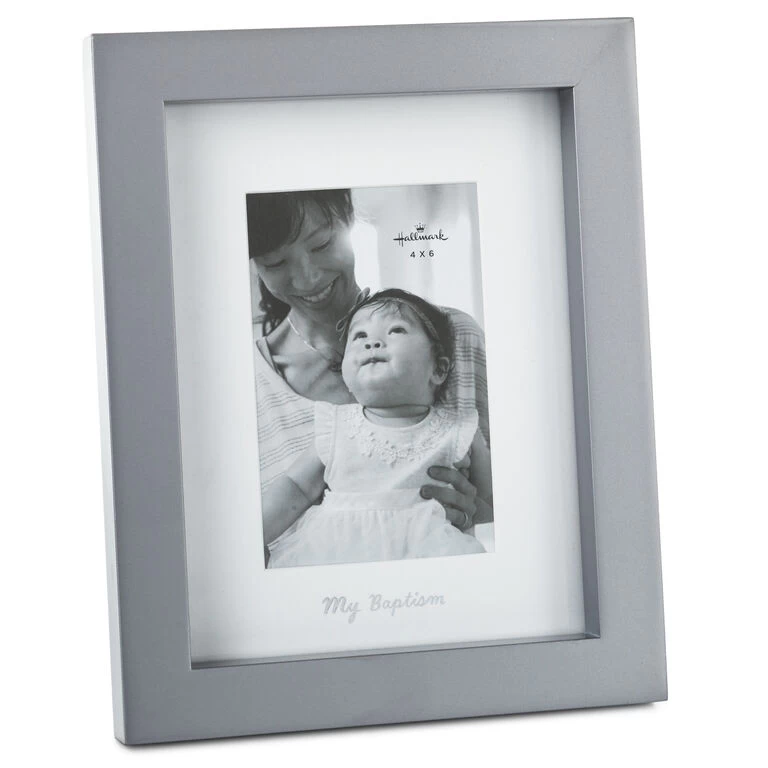 Create a lasting memento of a special baptism day with this elegant picture frame that includes a white mat with the words, “My baptism.” Place a 4×6 vertical photo inside to create a lasting memory of the joyful day. Silver-finish photo frame makes a thoughtful gift that parents, grandparents and godparents will treasure.