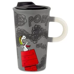 - Peanuts Snoopy travel mug features Snoopy on his doghouse with smoke and sound words all around. Fill mug with hot liquid to turn smoke design and lettering from gray to white.