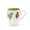 - Blue ceramic mug features rainbow designs, extra-wide handle and unglazed, recessed base.