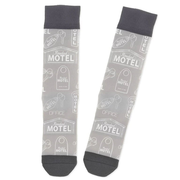 - Schitt’s Creek novelty crew socks feature Rosebud Motel designs and a fun message.
