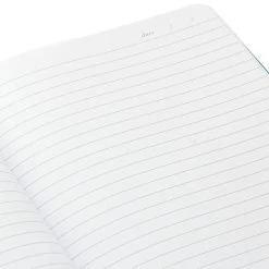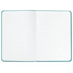 - Faux leather notebook features turquoise blue cover and includes a slim pen housed in the spine.