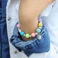 - Jilzarah youth stretch bracelet features colorful polymer clay beads and metal charms on elastic cord.
