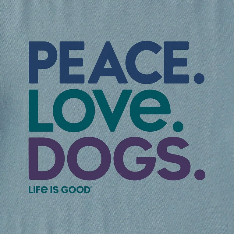 Share your world views—full of positivity and a little dog hair—with this gray-blue Life Is Good V-neck T-shirt featuring weathered lettering in cool tones of navy blue, forest green and deep purple. Washed for softness and comfort, the short sleeve women’s Crusher Tee Is easy to wear and perfect to layer, with a slight waist shape and ribbing at the neck. Makes a great gift for a dog mom.