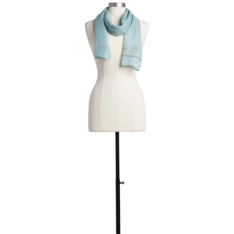 - Light green polyester women’s fashion scarf features a heartfelt message in gray lettering.
