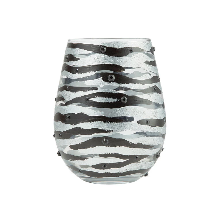 - Lolita handpainted stemless wine glass features zebra stripes design.