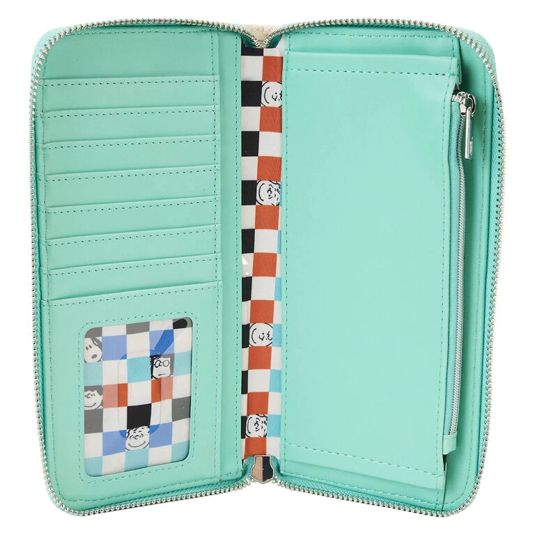 Inspired by a very relaxed Snoopy and his feathered friend, Woodstock, this zip-around faux leather wallet features appliqué and top-stitching details of the two friends snoozing atop Snoopy’s red doghouse on the front and fun printed designs on back. This charming clutch wallet keeps all of your cash, credit cards, loyalty cards and IDs safe and organized while you go about your errands and shopping excursions in style. Hallmark exclusive Snoopy wallet makes a perfect gift for Peanuts fans.