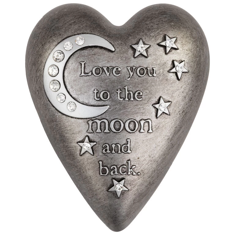 - Heart-shaped trinket box features moon and stars design and heartfelt quote on lid.