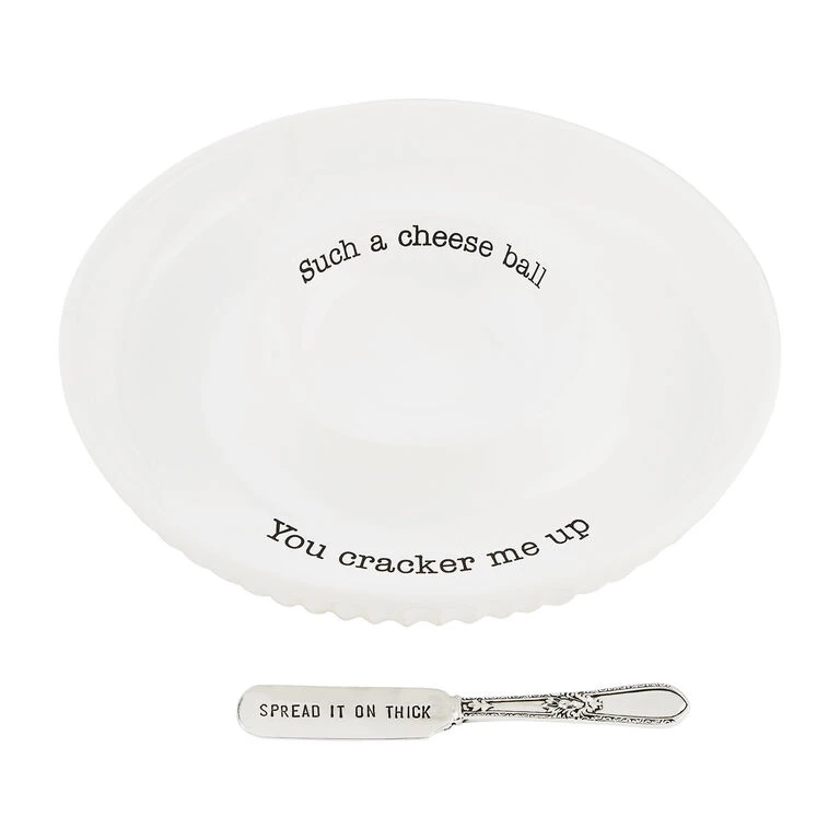 Bring some levity to your next holiday gathering with this two-piece appetizer set embellished with humorous messages. The ceramic cheese ball tray features a center well to hold a cheese ball and outer trough for crackers, with a silver-plated spreader included. Makes a great hostess or holiday gift.