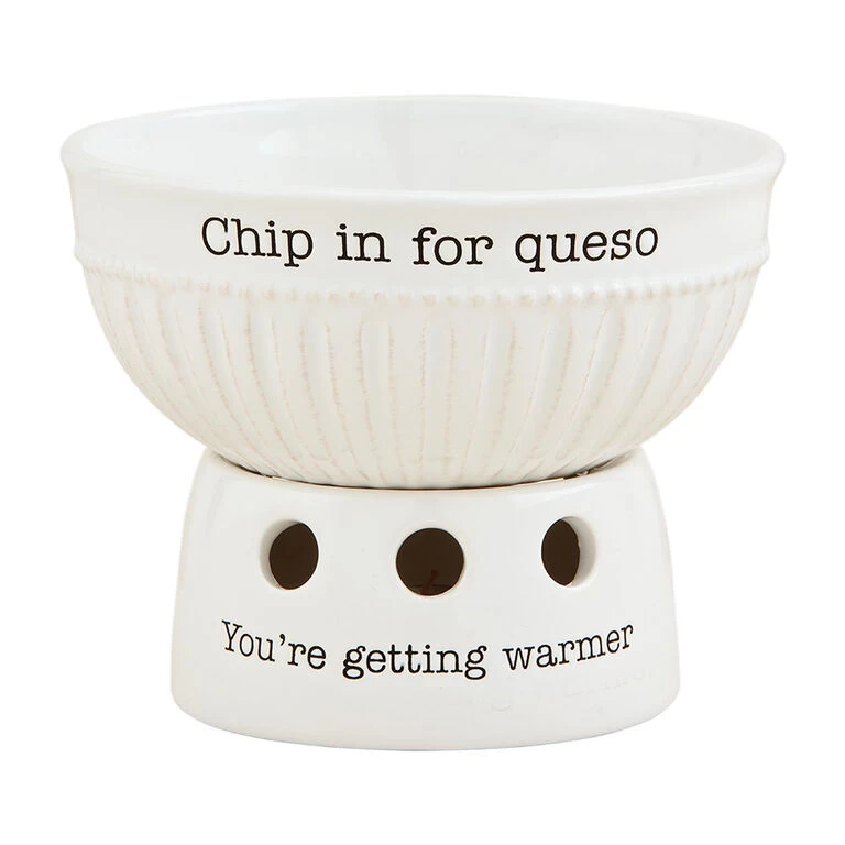 - Mud Pie 2-piece ceramic queso warming stand features fun sayings and comes with a tea light.
