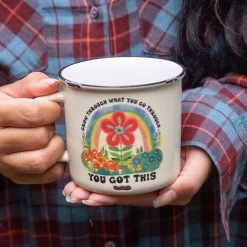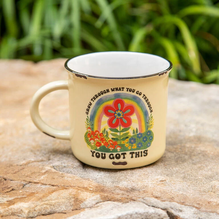 Start the day with a cup of coffee or tea and an empowering reminder that getting through tough times makes you stronger. This Natural Life ceramic mug features a sweet, retro floral and rainbow design with a motivational message and a weathered finish. Inspiring camp mug makes a wonderful get-well or encouragement gift for someone special.