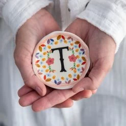 • Ceramic trinket tray from Natural Life features a single letter monogram and floral design.