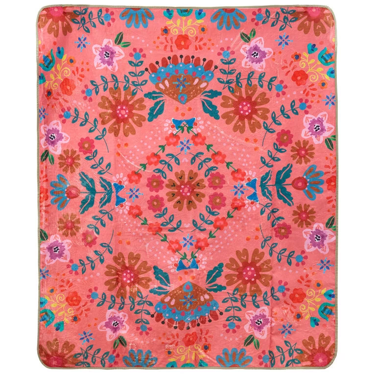 - Natural Life water-resistant picnic blanket features pink floral mandala design.