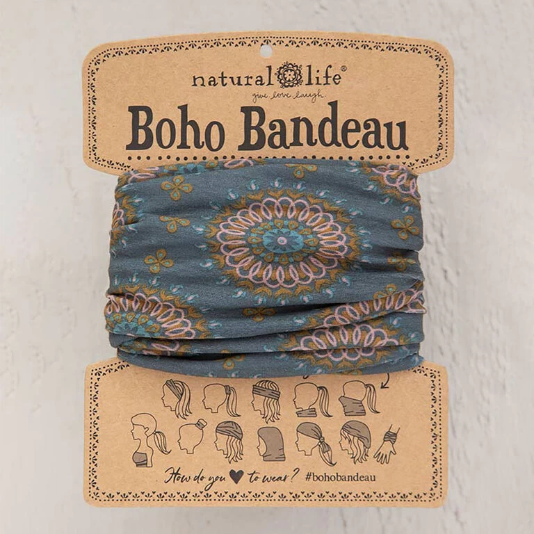- Natural Life 100% polyester Boho Bandeau headband features wearing ideas on package.