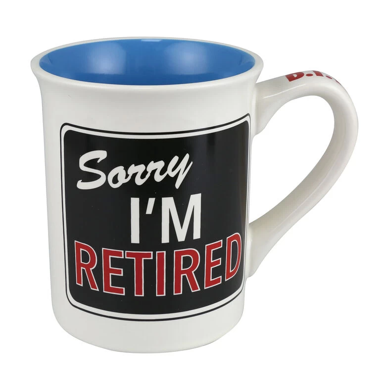 This playful mug adds a twist to a “Be back soon” store sign for a retiring friend or family member. Instead of “sorry, we’re closed” message, this sign mug notifies everyone in range with a “sorry I’m retired” message on front and a broken clock on the back. Fun retirement mug makes a great gift idea for yourself or a former coworker.