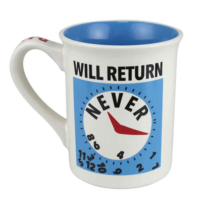 - Ceramic mug from Our Name Is Mud features a funny version of a “Be back soon” sign.