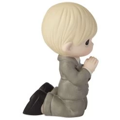 - Precious Moments handsculpted porcelain miniature figurine with handpainted details features boy kneeling with a rosary.