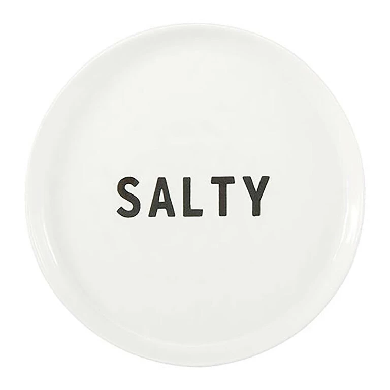 “Mmm” your way through umami snacks, hoard some hors d’oeuvres, and slake your salt cravings with this cute set of white ceramic dishes from Santa Barbara Design Studio. Perfect for guests to use as appetizer plates during a party or for everyday use, each plate features “Salty” in all-caps black lettering. Set of three small plates makes a great housewarming or wedding gift.
