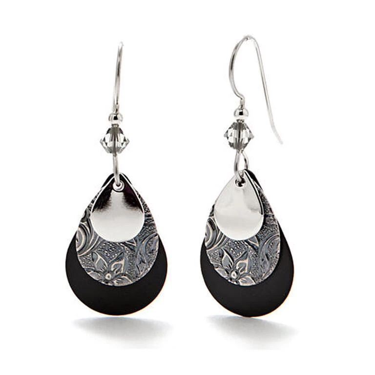 You get three layers of personality in this one pair of teardrop earrings. Handcrafted, high-quality jewelry features hammered, textured and black matte layers with a crystal accent to complement your outfit. The unique, wearable art is set on silver-tone surgical steel hooks for metal sensitivities. Makes a lovely gift for her birthday, anniversary, holiday or just because.