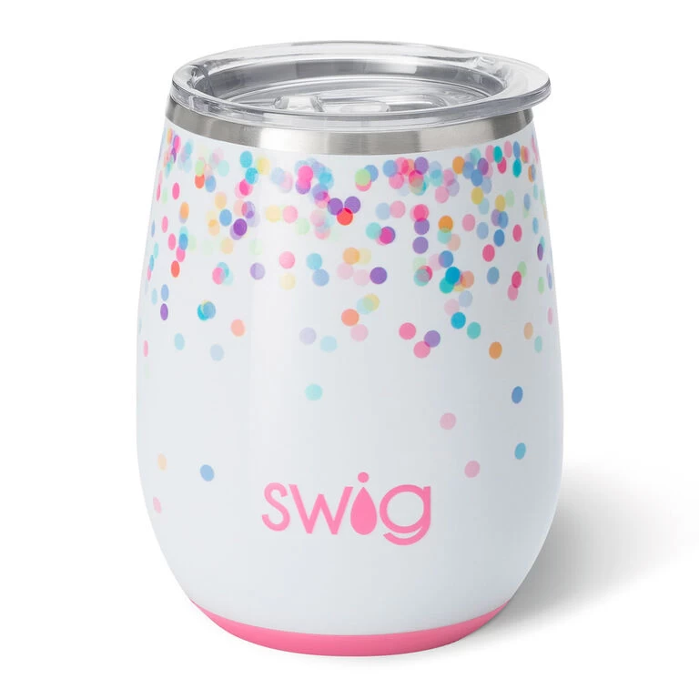 - Swig stainless steel stemless wine glass features a pastel dots design on white.