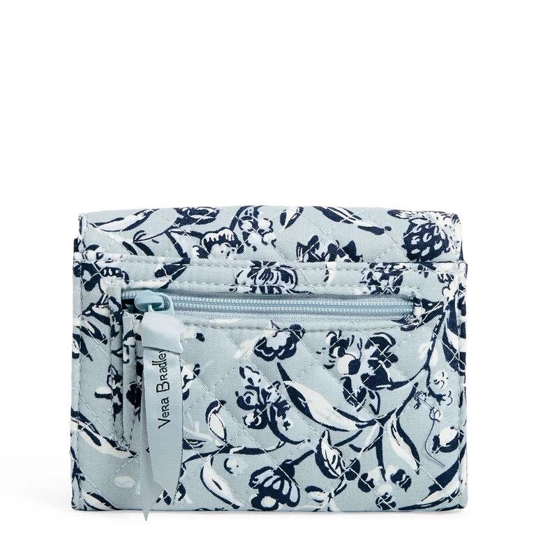 - Vera Bradley compact wallet features Perennials Gray pattern.