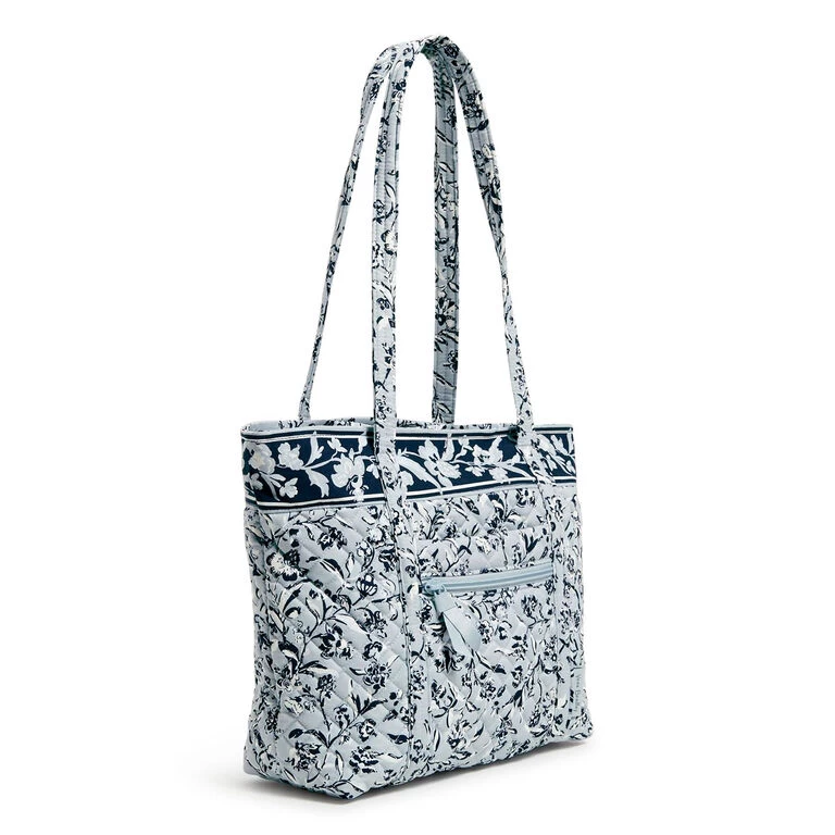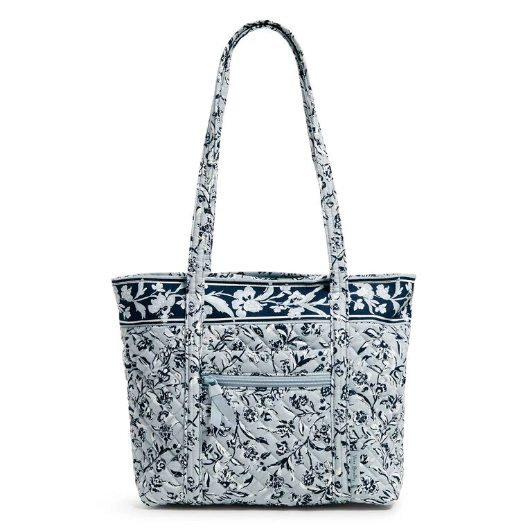 Lots of pockets inside and out make this timeless tote from Vera Bradley a must-have for any woman on the go. Pack it full of work, vacation or errand essentials to get you through your days in comfort and style. The small tote bag is made of light gray quilted, recycled cotton fabric with a navy floral pattern that goes with just about anything.