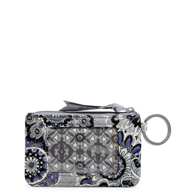 This might be the perfect case for quick errands and travel! Just tuck your cards and cash in the lined interior compartment and zip it closed. Quilted recycled cotton fabric in gray with black medallions pattern is lightweight, making this compact wallet from Vera Bradley a must-have! Convenient front window holds your ID securely. And it includes a large key ring for easy access to your keys.